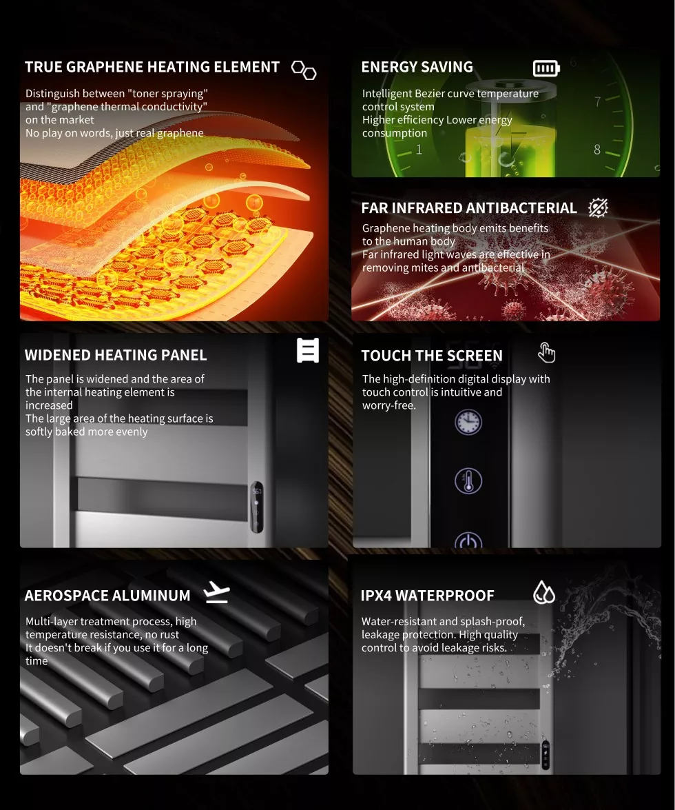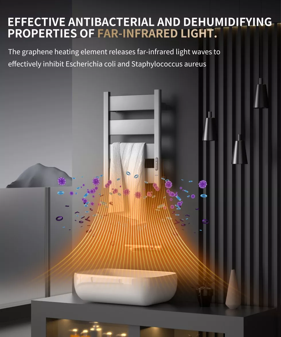 Шестиэтажный высококачественный дизайн полностью удовлетворяет потребностям полотенец, таких как сухие крышки для волос и полотенца для ванн в домохозяйствах. Благодаря однородным характеристикам нагрева, он гарантирует, что все части больших полотенец для ванны можно высушить равномерно, избегая неровной сухости и влажности. Подходит для различных сценариев, включая отели и открытые кемпинги, эффективно изолируя бактерии и запахи, а также защита кожи от бактериальных полотенец.