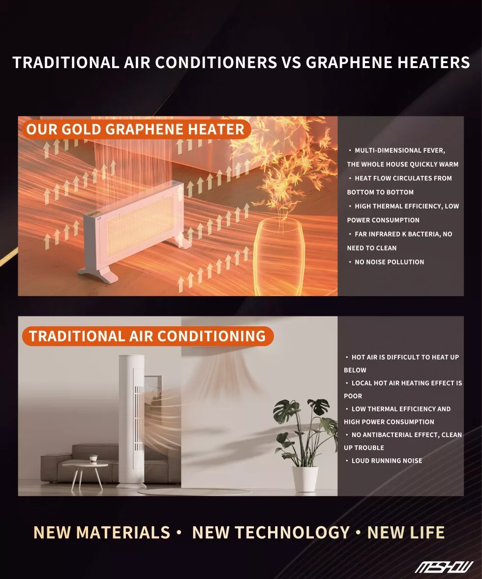 Meshow продвигает высококачественные вертикальные обогреватели белого графена 1800 Вт на внутренних и международных рынках. Благодаря технологии отопления графена, высокой эффективности и экономии энергии, ее высоко одобряют пользователи дома и офиса и стали предпочтительным оборудованием для отопления. Нагреватель изготовлен из графенового материала, который достигает высокоскоростного преобразования электрической энергии в тепловую энергию с сверхвысокой теплопроводности, что приводит к быстрому и одному нагреву. Его эффективный режим создает превосходные энергосберегающие эффекты, особенно подходящие для холодных зимних сезонов, обеспечивая непрерывное тепло.