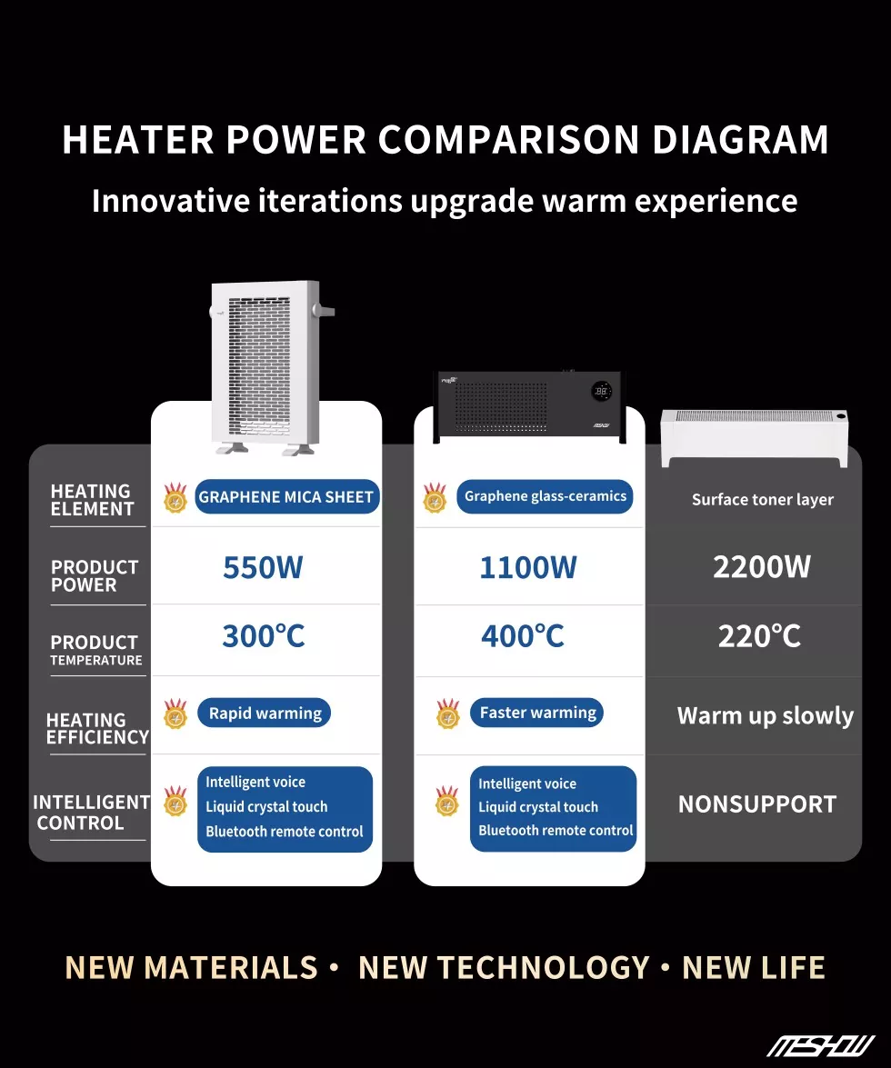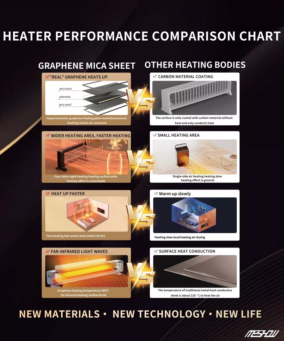 Meshow выпустил свой последний продукт, вертикальный обогреватель белого графена 1800 Вт, который обладает высокой производительности безопасности, встроенной защитой от перегрева и системой безопасности с дампами, гарантируя, что пользователи могут использовать его с душевным спокойствием на протяжении всего процесса. Независимо от бытовой или коммерческой среды, этот обогреватель может достичь теплого нагрева, с высокой эффективностью, энергосбережением и безопасностью параллельно, что делает его предпочтительным решением для зимнего отопления.