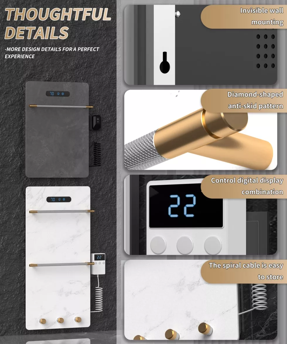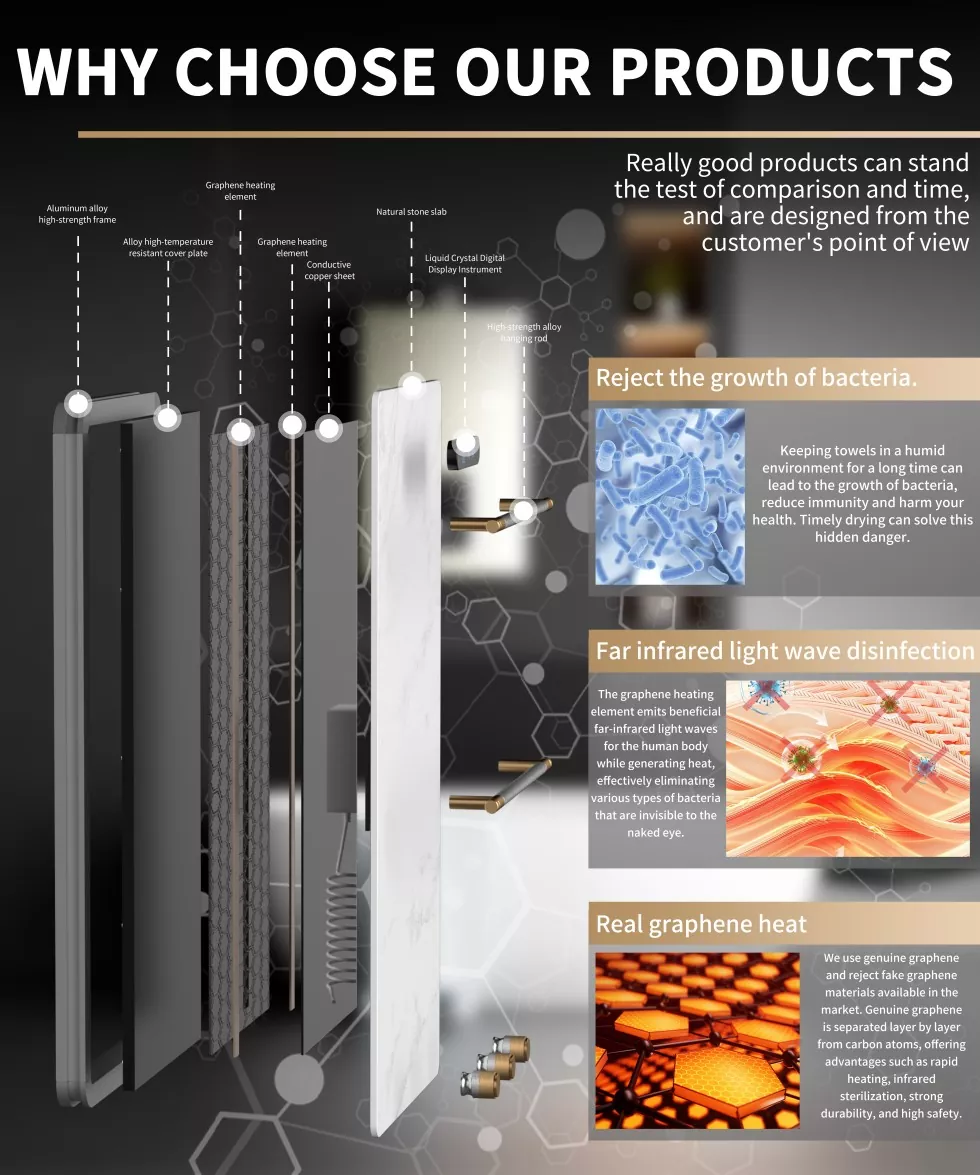 Стеллаж черного графена каменного полотенца быстро высыхает полотенца, сохраняя их сухость и предотвращая рост бактерий и плесени, вызванных влажностью, создавая более здоровую среду использования. Используя 4-16 мкм излумбного излучения для передачи тепловой энергии, авторитетными учреждениями было подтверждено, что эффективность убийства вредных бактерий, таких как Staphylococcus aureus, достигает 95%, а эффект удаления клещей составляет 100%, эффективно изюминг бактерий репродукцию и уменьшает возникновение отборов.