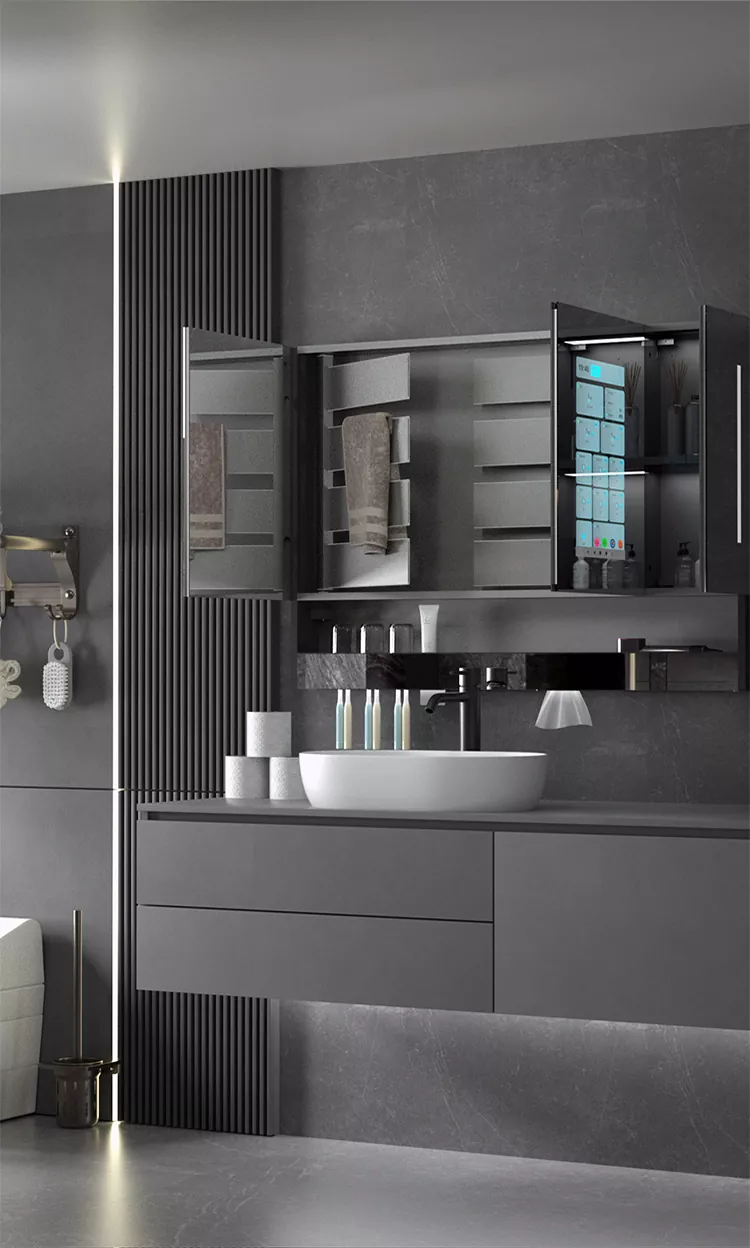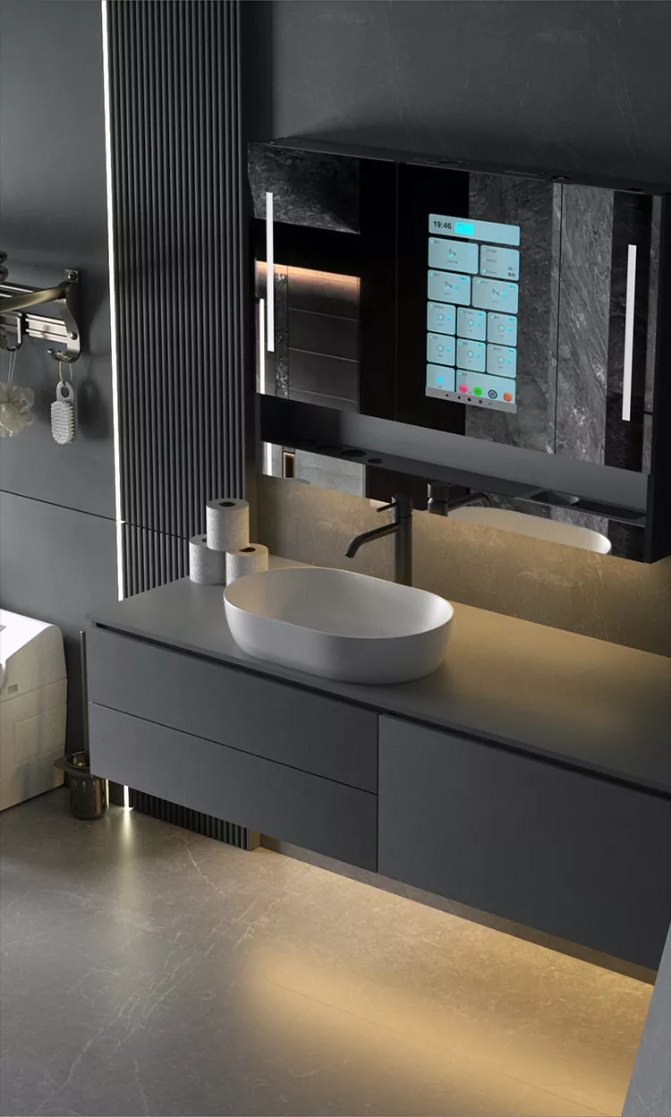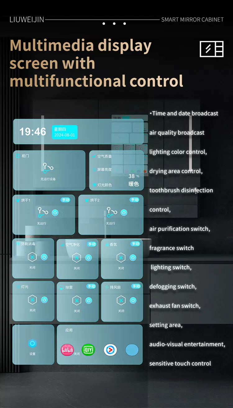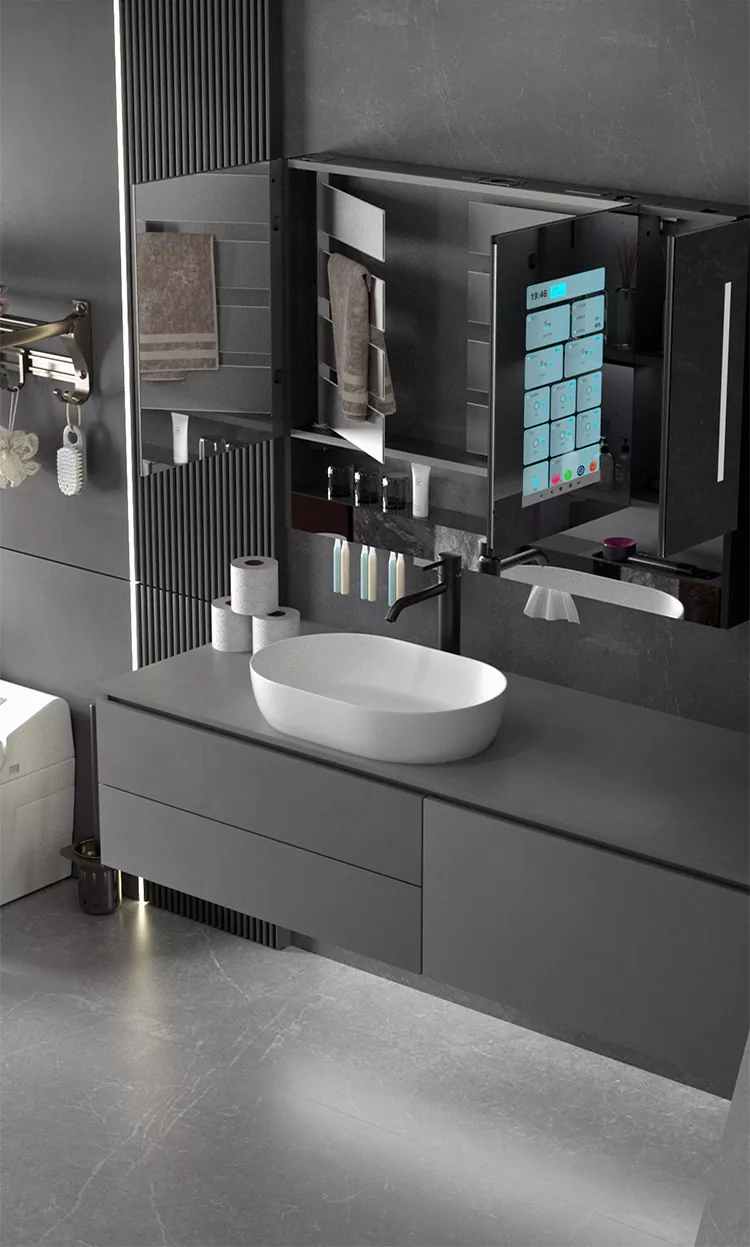 Как пионер графена, Мешоу поддерживает концепцию «Новых материалов, новых технологий и новой жизни». Этот интеллектуальный зеркальный шкаф Graphene Smart Bath настроен. Продукт использует фюзеляж сплава, многослойное распыление, фюзеляж долговечен и защищен от ржавчины. Зеркало зеркального шкафа оснащено зеркальным сенсорным экраном и интеллектуальным чипом. Он может завершить многофункциональное управление и аудиовизуальные развлечения на экране. Загрузите пользовательское приложение для загрузки. The product has rich functions.All models are equipped with standard led light strip, automatic toothpaste squeezing machine, tooth cup draining rack, tooth cup toothbrush ultraviolet disinfection device and shaver disinfection device.Embedded paper drawer, dual-purpose blower/dryer conversion device, mirror high-definition display touch screen, mirror defogging system, integrated controlControl center,The luxury model is additionally equipped with Графеновая нагрева и сушильная стойка для полотенец, индукционное дезинфицирующее средство для рук, интеллектуальная система ароматов и система очистки воздуха.